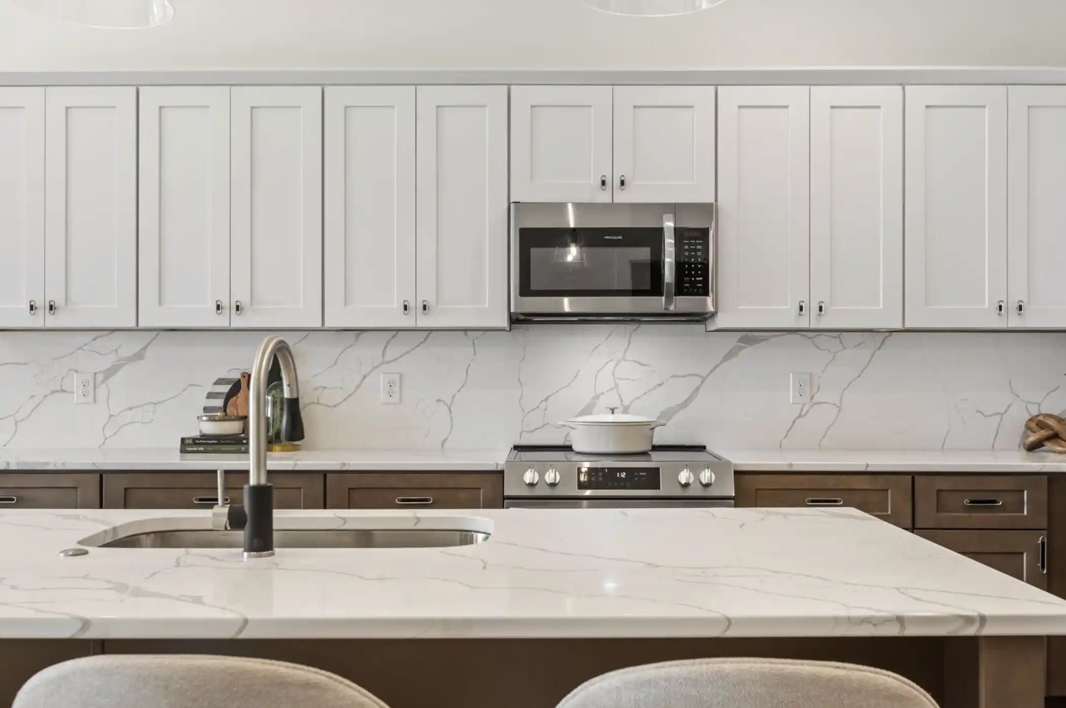 The kitchen combines function with style, featuring two-tone cabinetry, a substantial island with waterfall edge, and premium appliances. This practical layout works equally well for quick family meals or entertaining guests.